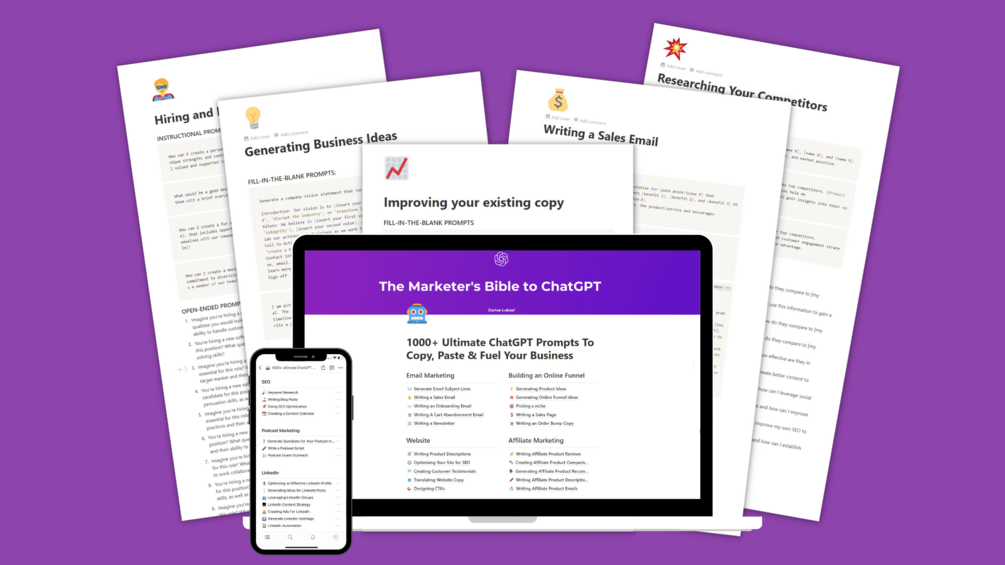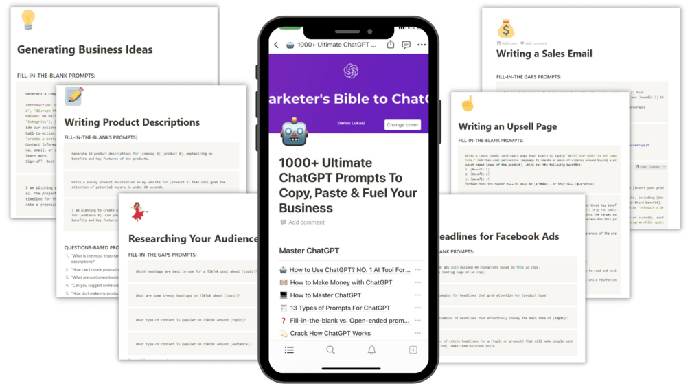 YOU'LL GET ACCESS TO: 1000+ ChatGPT prompts to copy, paste, and scale 99+ tasks for all your marketing needs 50+ examples to get personalized results Proven tricks to unlock ChatGPT fully Exact steps to get reliable results & scale Tips and research-based prompts to automate everything